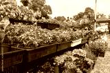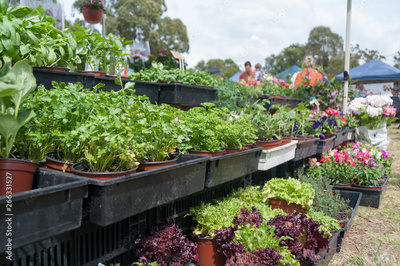 Green herbs in flower pots for sale on the farmers market