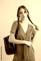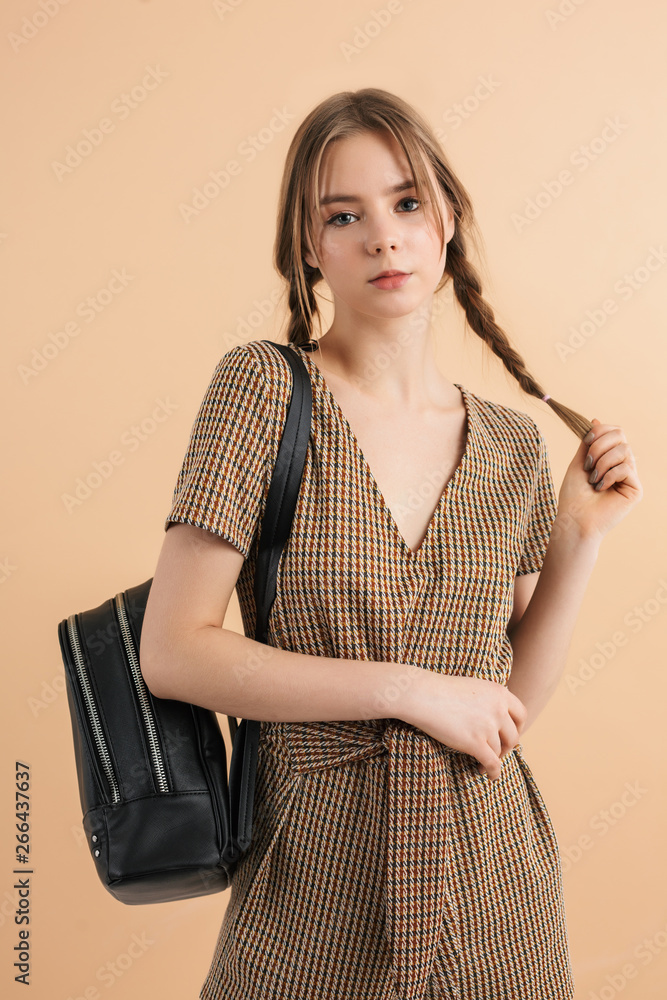 Young beautiful girl with two braids in tweed jumpsuit with black backpack on shoulder dreamily looking in camera over beige background isolated