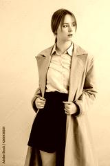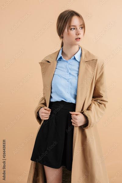 Young beautiful lady in trench coat and blue shirt dreamily looking aside while spending time over beige background