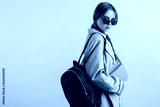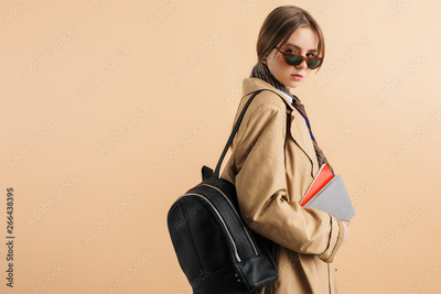Young pretty girl in trench coat and sunglasses with backpack on shoulder holding notepads in hand thoughtfully looking in camera while spending time over beige background