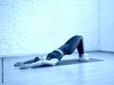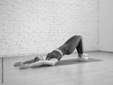 Gluteal bridge on pink small fitness ball. Young caucasian woman doing pilates with special equipment in fitness studio.