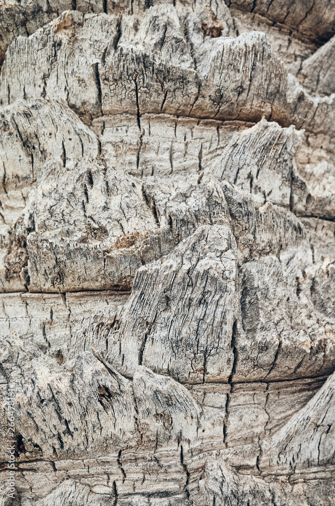 Palm tree trunk close up picture, natural background or texture, color toning applied, selective focus.