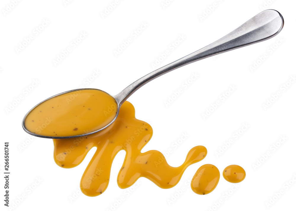 Mustard sauce, honey salad dressing with spoon isolated on white background, top view