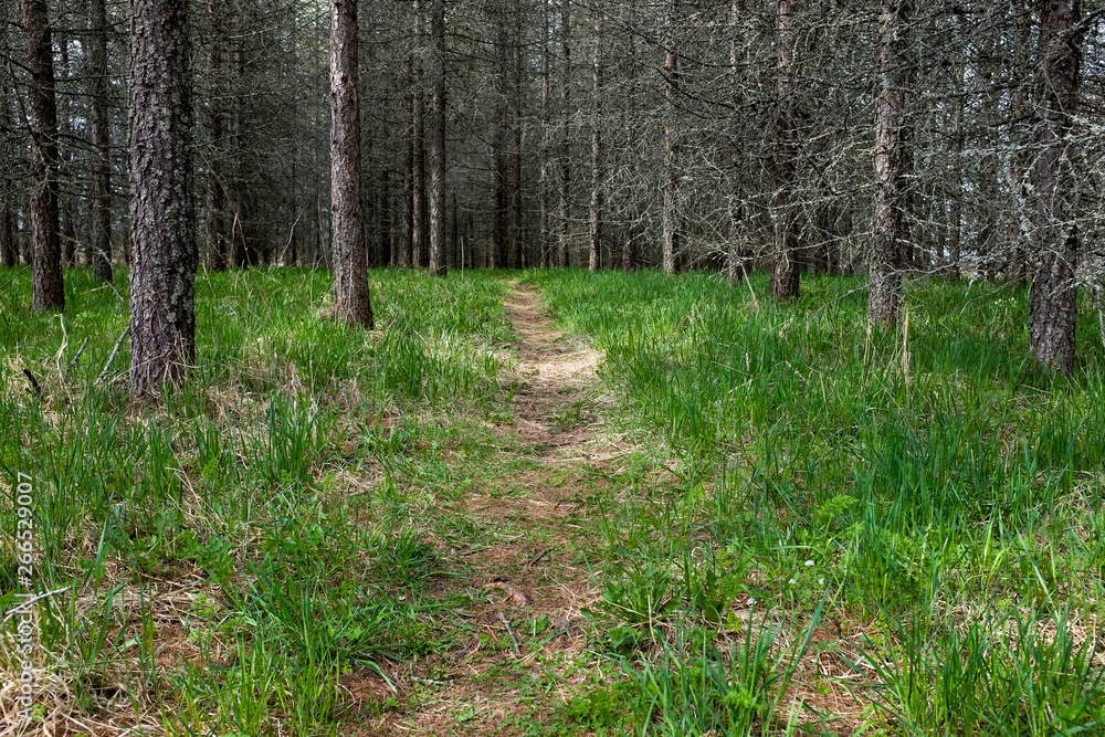 Footpath to dark forest. Larch forest in early spring, no leaves on trees yet.
