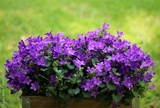 Purple flowers of Dalmatian bellflower or Adria bellflower or Wall bellflower (Campanula portenschlagiana) blooming in the wooden box on blurred background, Spring in Georgia USA.