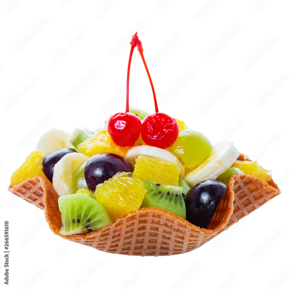 fresh diced fruits in waffle cone bowl decorated maraschino cherry on top is isolated on white background