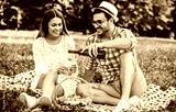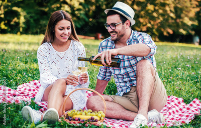 Loving couple enjoying picnic in the park. Love and tenderness, dating, romance, lifestyle concept