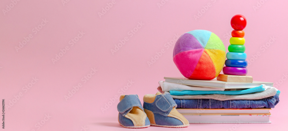 Donation concept. Kid toys, books and clothes fot donate or charity on pink background