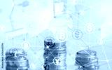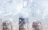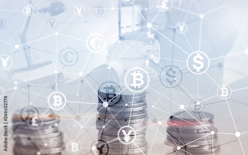 Bitcoin Euro Dollar Finance Web Money concept. oins on virtual screen double exposure.