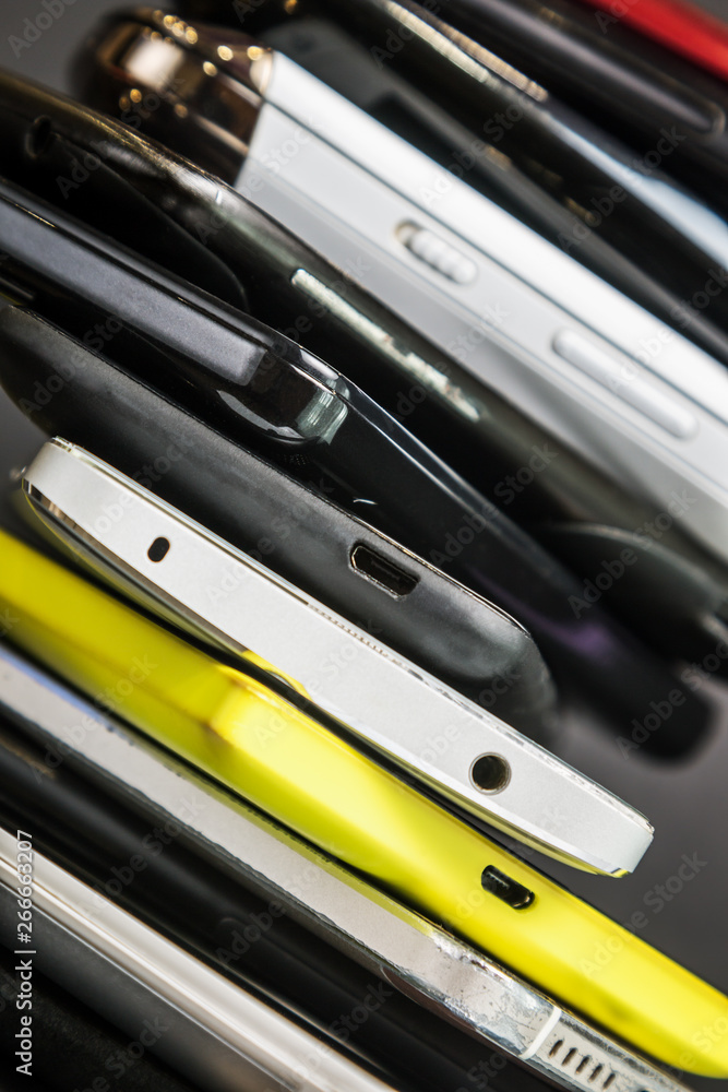old and broken smartphones and mobile phones. Background of old phones.