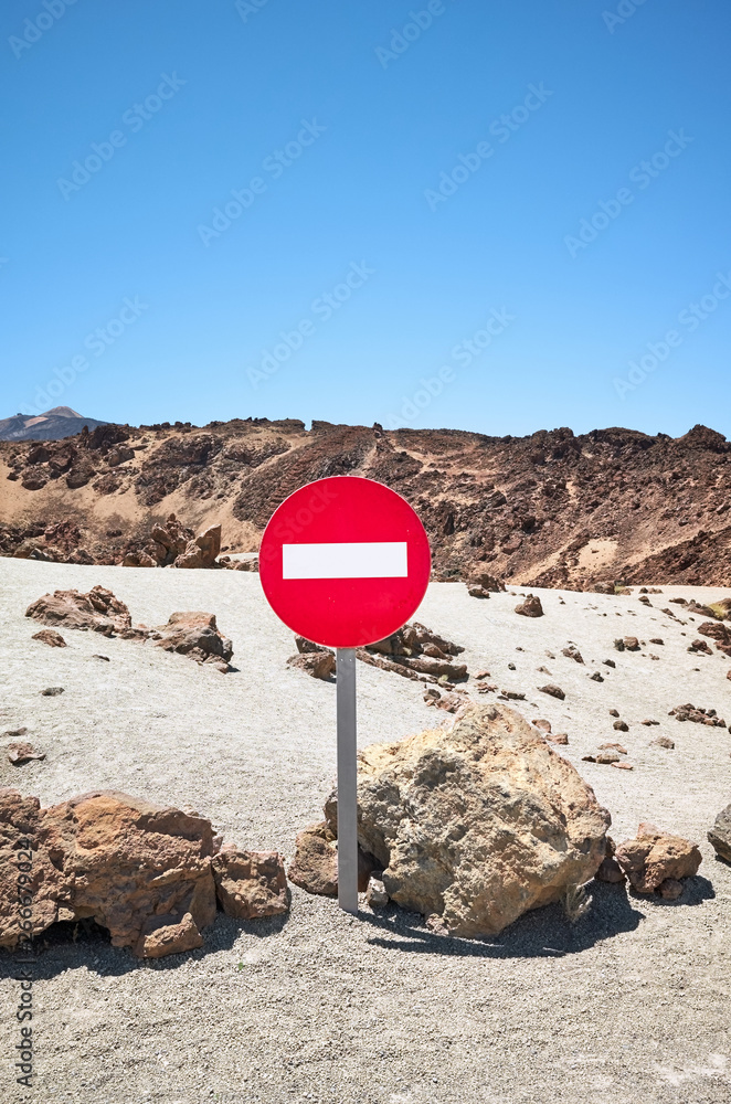 Mars like landscape with No Entry traffic sign, Mount Teide in background, Teide National Park, Tenerife, Spain.