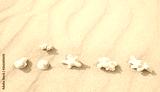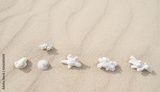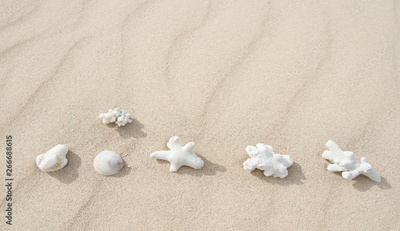 Sand beach texture background with white corals. Mock up and copy space. Top view. Selective focus. Banner