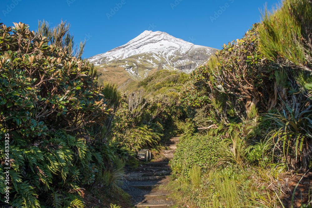 View of Mount Taranaki (or Mount Egmont) an iconic volcano of the Western region of North Island, New Plymouth, New Zealand.