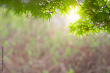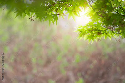 Close up beautiful view of nature little maple green leaves on blurred greenery tree background with sunlight in public garden park. It is landscape ecology and copy space for wallpaper and backdrop.