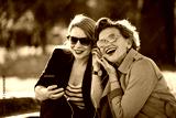 Mature mother and adult daughter listening to the music on smartphone in the park