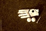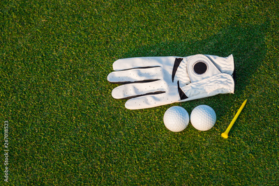 The golf sport equipment white glove ,golf ball, golf club and yellow tee golf with green grass background