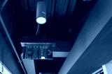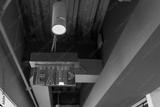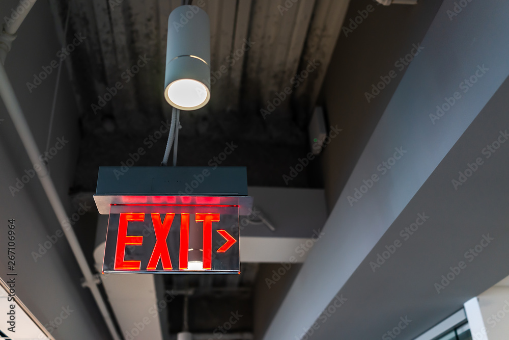 Red exit sign hanging from ceiling looking up view with arrow direction and color illuminated fixture in office building emergency closeup