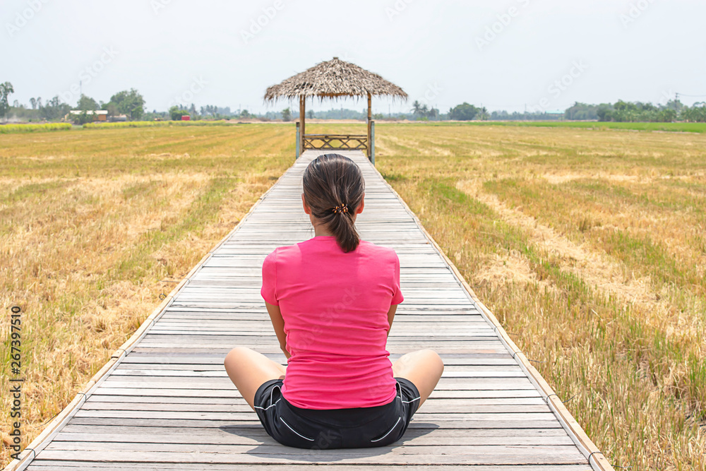 Woman sitting on a wooden bridge with a bamboo hut in the rice fields.