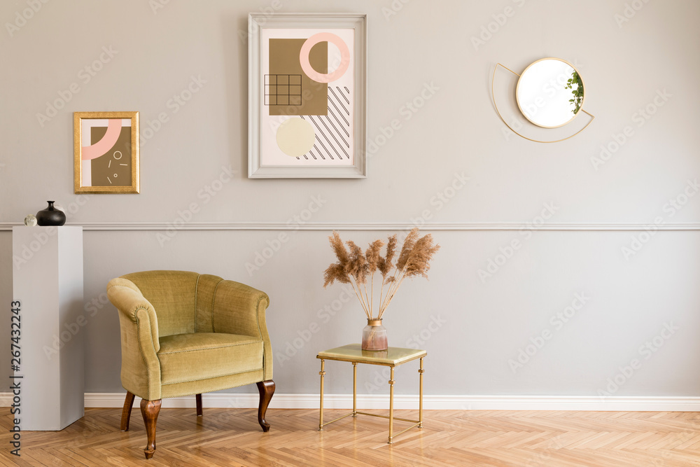 Stylish and luxury living room of apartment interior with elegant green armchair, retro table, gray stand and chic accessories. Mock up paintings frames on the molding gray wall. Nice home decor.