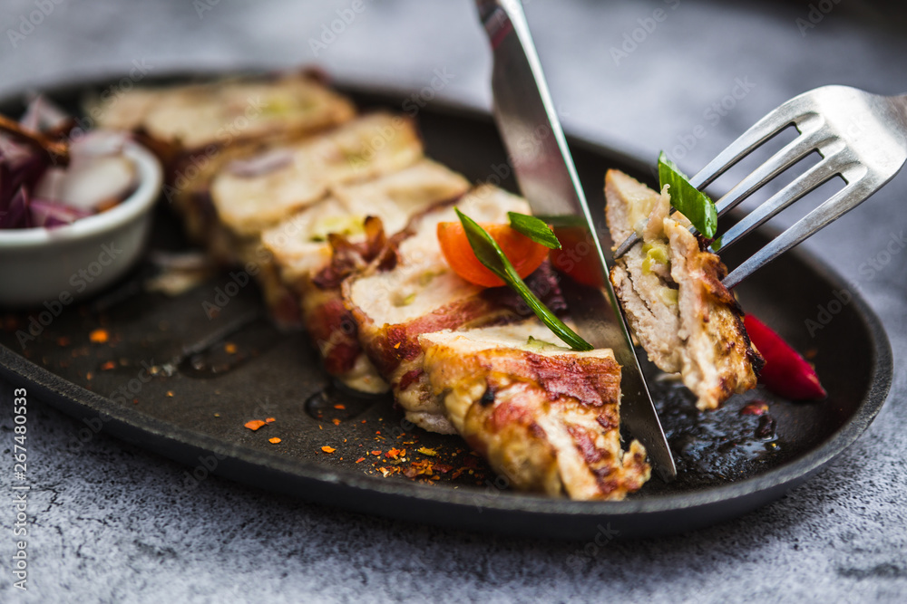 Grilled stuffed fillet with onion in black plate
