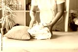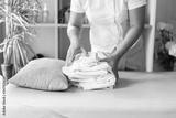 Shot of hotel maid in uniform making the bed with clean fresh towels or prepares a workplace massage bed in the spa for the reception of new clients. woman ,spa, services, health and beauty concept.