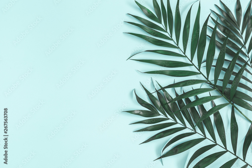 Palm leaves on pastel blue background. Summer concept. Flat lay, top view, copy space