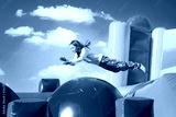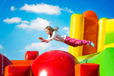Happy little girl having lots of fun while jumping from ball to ball on an inflate castle.