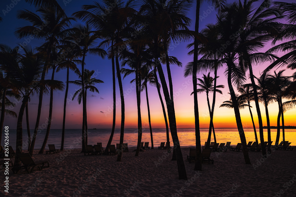 Palm trees silhouette on sunrise tropical beach. Punta Cana.