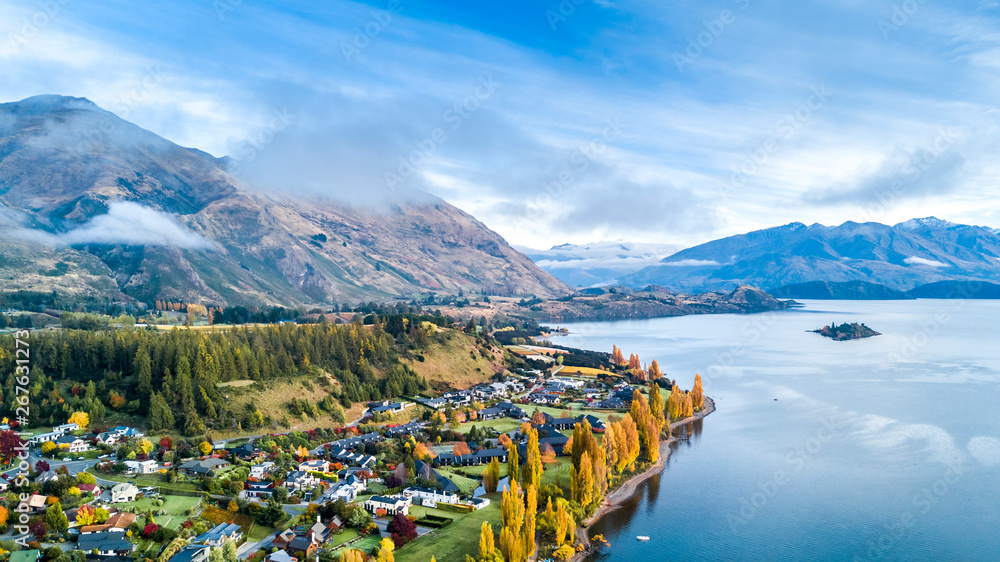 Small town surrounded by yellow autumn trees on a shore of pristine lake with mountains on the background. Wanaka, Otago, South Island, New Zealand