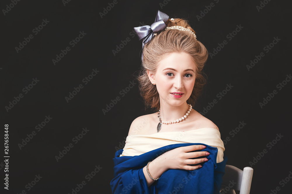 Woman in the Studio with a retro make-up and hairstyle in the style of painting by Thomas Gainsborough "Lady in blue" 1780