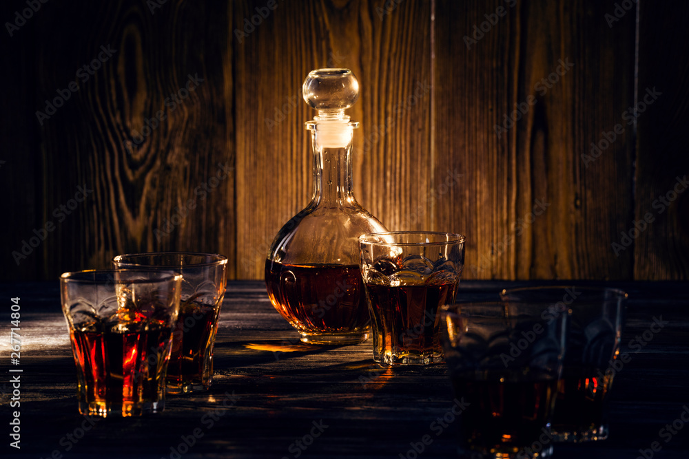 Elite alcoholic drink for men, full glasses on the table in the bar, brandy in glasses, the solution in a dark light key