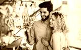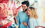 Happy couple buying candies on the street market. Love, dating, romance, shopping