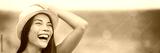 Happy young Asian woman laughing of fun enjoying relax life on ocean blue summer background banner panorama.