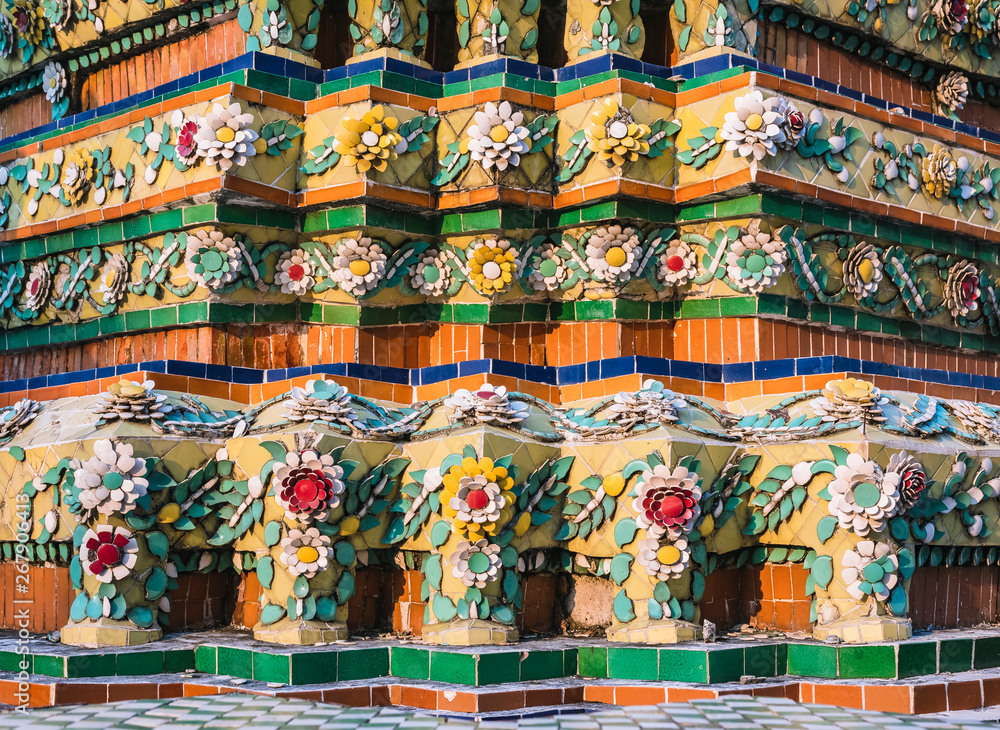 Wat Pho Colourful tiles floral pattern Mosaic on Pagoda Temple Landmark Bangkok Thailand