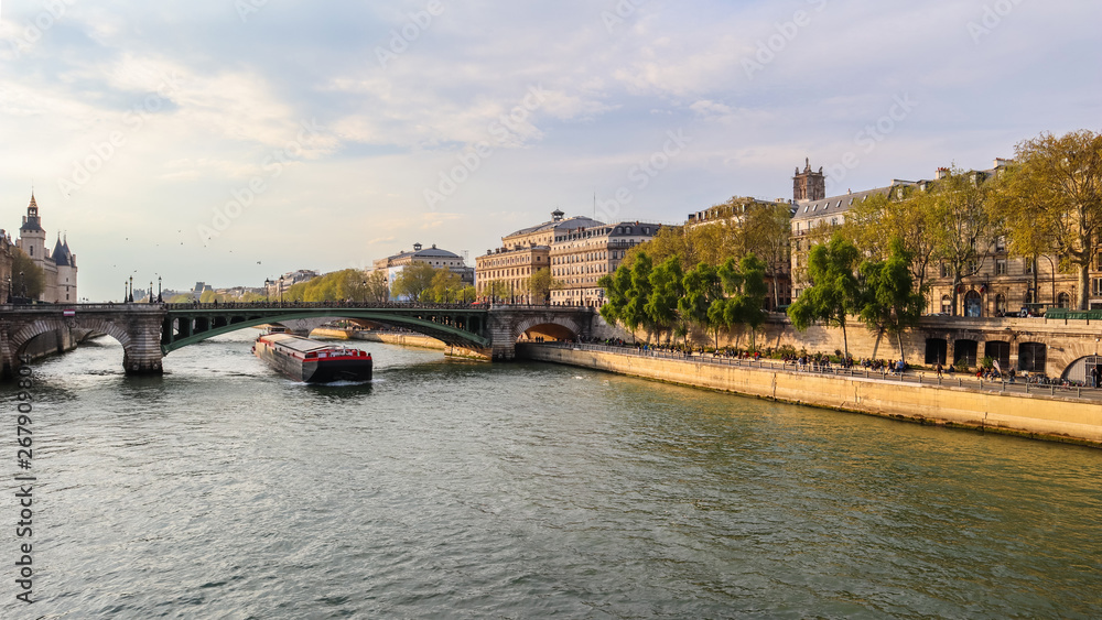 Beautiful cityscape of Paris, bridge Pont Sully across Seine river and a ship. France. April 2019