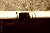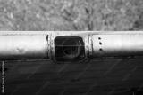 Glass opening on wing of old Douglas Dakota DC-3 WWII plane placed in field at exhibit on warm sunny spring day