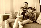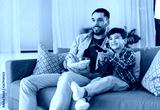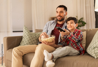 family, childhood, fatherhood, technology and people concept - happy father and little son with popcorn and remote control watching tv at home in evening