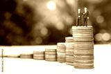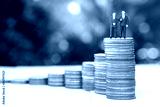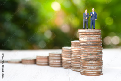 Miniature figure business man manager standing on glowing coins stack with greenery background. Successful investor concept.