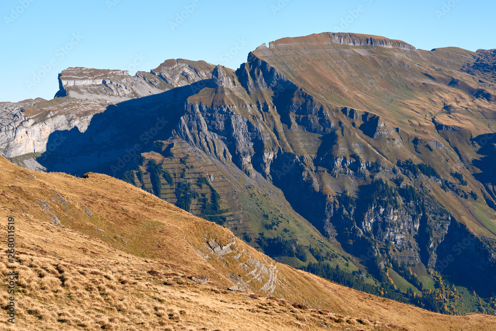 Mountain panorama in the morning in Lauterbrunnen region in Switzerland.