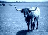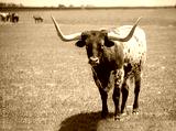 Texas longhorn bull steer cow with long horns standing in green pasture