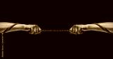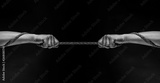 Conflict, tug-of-war, rope. Hand holding a rope, climbing rope, strength and determination concept. Safety. Macro shot isolated over black background.