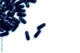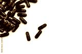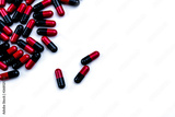 Red-black capsule pills isolated on white background with space for text. Pharmaceutics concept. Pharmaceutical industry. Pharmacology and toxicology concept. Pharmacy product. Drug use in hospital.