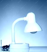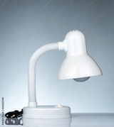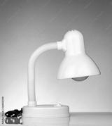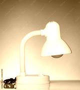 Unplugged white modern table lamp isolated on white table on gradient background. Desk lamp for reading a book in dormitory room. Home and office furniture with minimalist design. Desk spotlight.