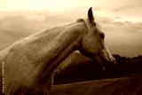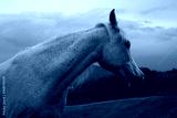 Portrait of a horse: beautiful, female, white or grey arabian horse in country house. Farm life