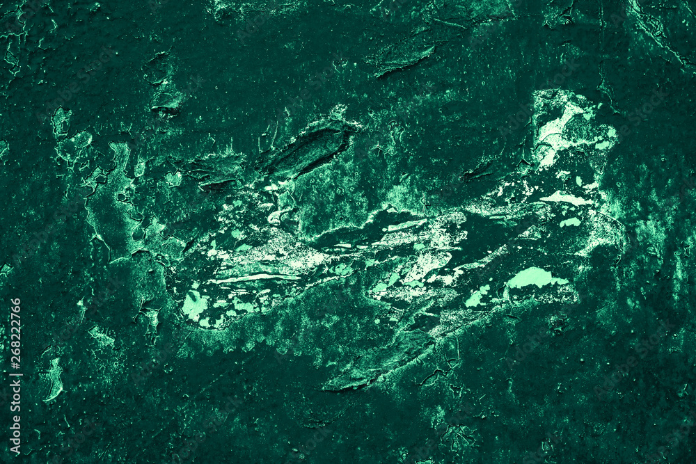 Vintage green background. Rough painted wall of emerald color. Imperfect plane of virid colored. Uneven old decorative toned backdrop of green tint. Texture of emerald hue. Ornamental stony surface.
