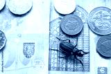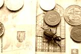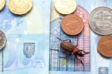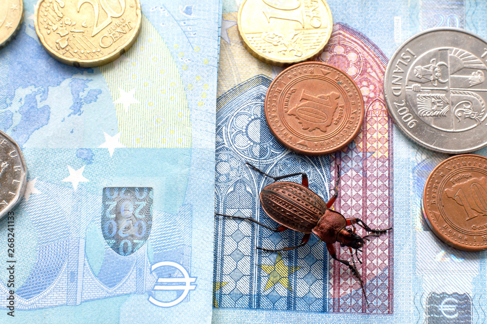Ground beetle on the bill twenty euros, small coins of Europe.