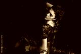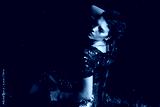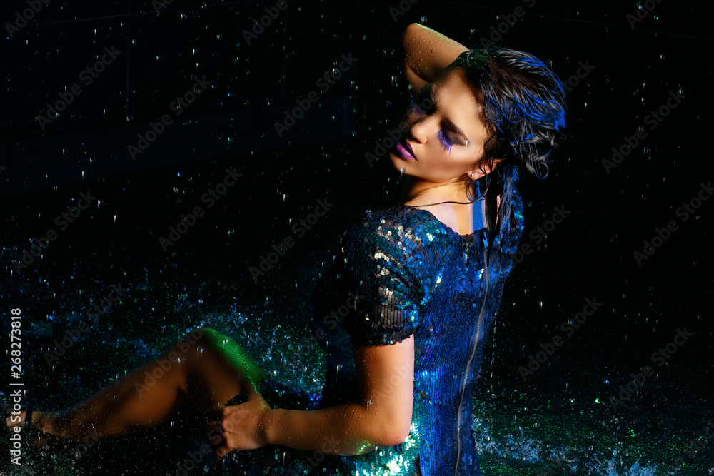 Young sexy woman sitting on wet floor with water drops. Gren light effect. Seductive girl dressed in a sparkling dress in sequins resembling fish scales in a dark room. Water studio, spray, splashes.