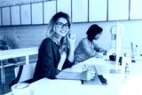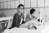 Beautiful female office worker carrying out administrative work for company. Indoor portrait of cute blonde student doing homework with asian universuty friend.