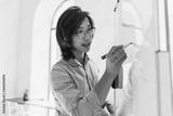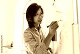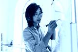 Concentrated asian man in blue shirt using flipchart and marker for work. Indoor portrait of brunette chinese employee in glasses writing something for presentation with colleagues.
