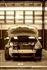 closeup car repair in garage service station with soft-focus and over light in the background